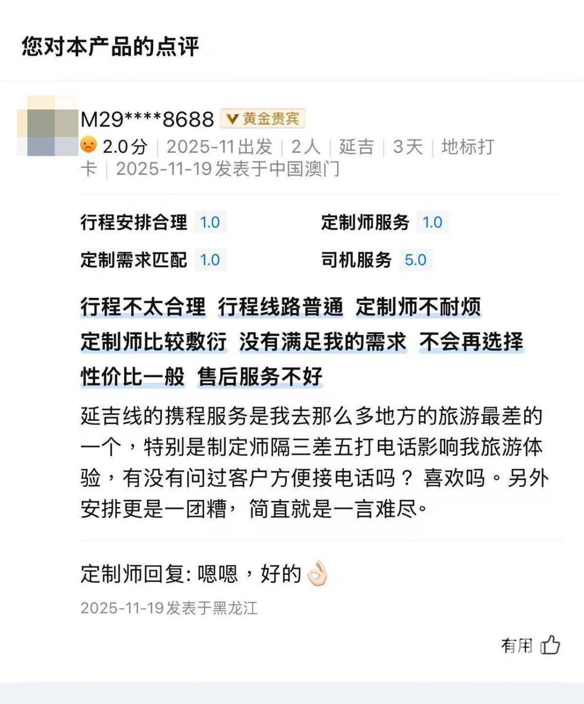甘先生发布的评论(来源:受访者)之后,甘先生在携程平台给本次出行打了2.0分(最低1.0分),勾选了“行程不太合理、线路普通君盈配资,定制师不耐烦且敷衍,没满足需求,售后服务不好”等评价,还留下了“延吉线的携程服务是我去那么多地方旅游最差的一个,定制师隔三差五给我打电话影响体验,安排一团糟”的文字评价。甘先生认为上述评价是如实客观的,“差评发出后,定制师也只是在评论后写了句‘嗯嗯,好的’。”