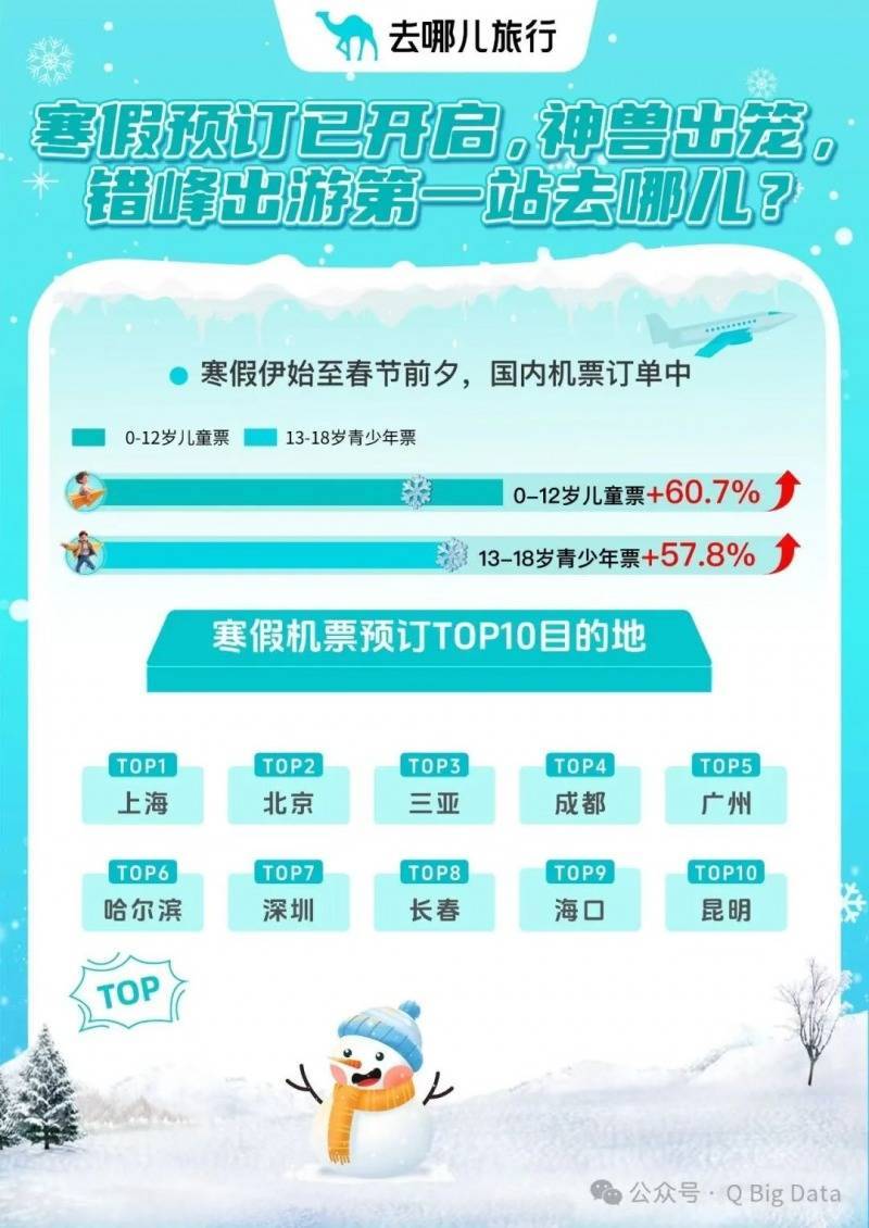 r11月以来,各地陆续公布了寒假时间。据统计,今年东北、海南的中小学生,寒假时长都超过了40天。去哪儿旅行数据显示,2026年1月中旬寒假开启后至春节前夕,国内航线机票的支付均价比春节便宜三成。不少家庭选择避开春节高峰,把寒假前半段作为“亲子错峰出游”的最佳时机。这段时间,儿童、青少年的机票预订量显著增长,且增幅远超成人。其中,0-12岁儿童的机票预订量同比去年寒假增长60.7%,13-18岁青少年的机票预订同比涨了57.8%。期间,游客南下避寒的需求明显,国内机票的TOP10热门目的地包括上海、北京、三亚、成都、广州、哈尔滨、深圳、长春、海口、昆明。